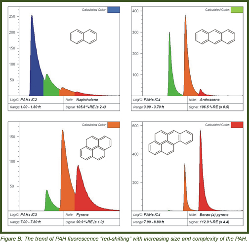 Fuels/oils contain complex chemical composition, which results in broad waveforms. The “EPA 16” PAHs only account for approximately 1 percent of the PAHs in crude oil, so there are usually a wide variety of PAHs fluorescing. From “blue to red” some common fuel/oil waveforms, shown in Figure C, include the following: