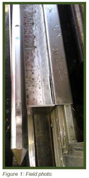 A schematic of the downhole function is shown in Figure 1. The probe functions by injecting an aqueous delivery fluid containing a proprietary hydrophobic dye through a small injection port that is situated 22 cm below the LIF window. As the probe is advanced through the subsurface the injected dye contacts the soil and quickly partitions into any DNAPL (if present). Standard LIF tooling is used to detect the dye-labeled chlorinated solvent DNAPLs. The dye is injected at a modest 1 mL/sec target rate in a controlled manner in order to lay down a “snails trail” of indicator dye along the side of the probe. Low dye injection rates avoid the risk of flushing DNAPL ganglia back into the soil grains and therefore outside LIF’s zone of optical interrogation. Automated recording of the flow rate of the dye solution and injection back-pressure yields useful information about the hydraulic conductivity, in a fashion similar to other direct push hydraulic profiling tools, such as the Geoprobe HPT™ (Hydraulic Profiling Tool) and Waterloo APS™ (Advanced Profiling System).