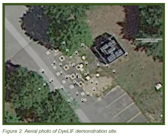 The capability of the DyeLIF was recently demonstrated at a small footprint chlorinated spill site in Massachusetts. Tests of chlorinated solvent DNAPL recovered from the site revealed a mixture of 59% trichloroethylene, 34% 1,1,1-trichloroethane with various solvents and petroleum hydrocarbons making up the balance. Local geology in the demonstration area can be generally classified as fine sand and silt with intermittent silt and clay layers. A continuous silt layer is observed at 14 m below ground surface (bgs), which is consistent with other areas of the larger site. Previous investigations show the DNAPL impacted area is rather small, heterogeneously occupying an approximately 30 m x 30 m area, with DNAPL penetrating down to bedrock at about 27 m bgs. Figure 2 illustrates the limited footprint of the source term DNAPL.
