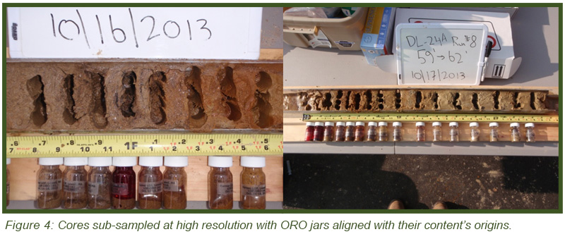 - Photograph open cores, immediately cover in foil to avoid loss of VOCs, and sub-sample at high resolution (2-10 cm spacing) with four small sub-samples collected at each depth horizon using a plunger tool and placed in small sample vials (three 20 mL VOA vials, one containing Oil Red O and water for visual screening, one for DyeLIF screening, and one for moisture content and organic carbon analyses; and one in a 40 mL VOA containing methanol for quantitative analyses).