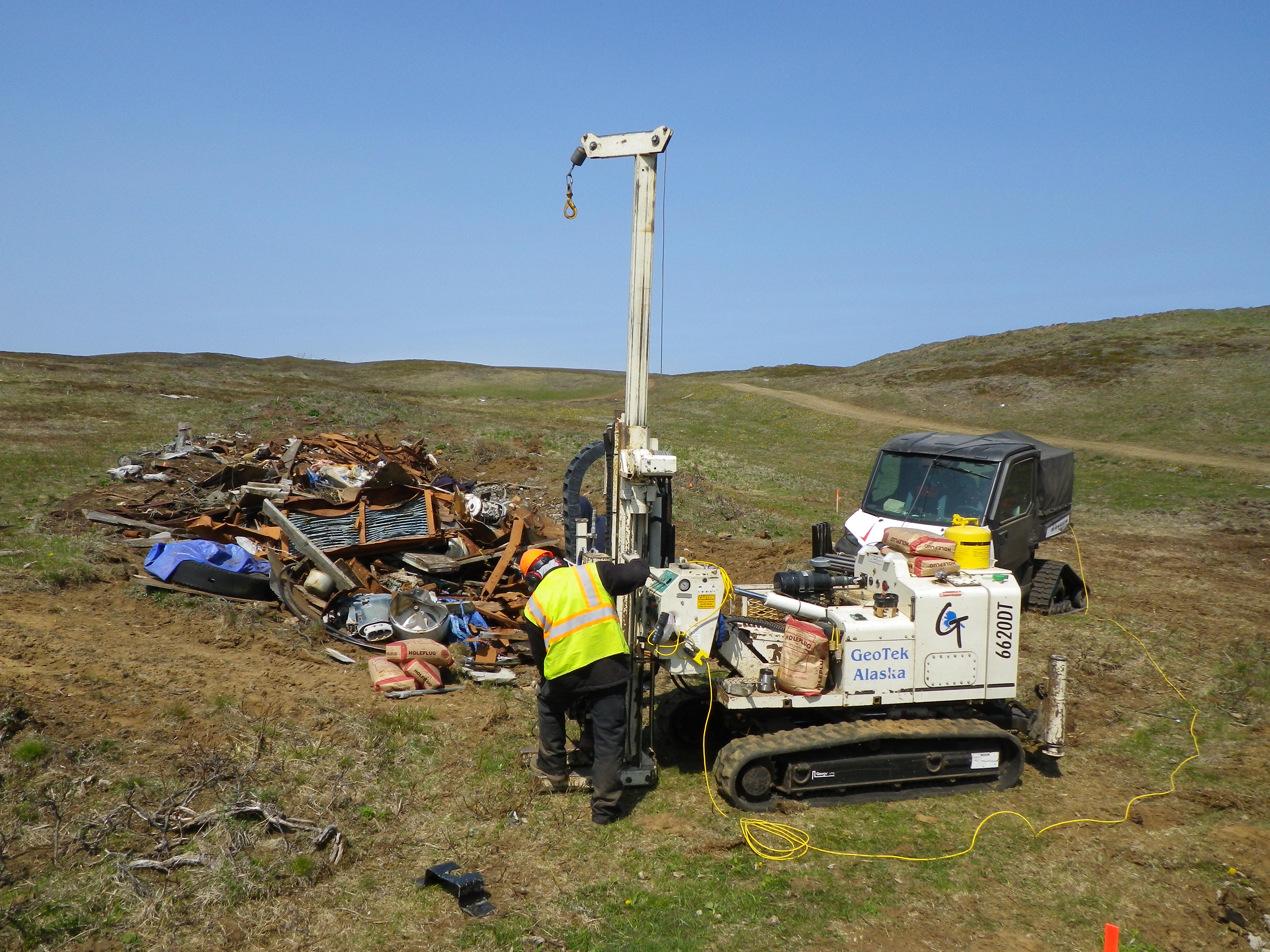 To screen the site for heating oil and diesel fuel that may have been released into the soil, Bristol contracted GeoTek Alaska, specifying for the site to be screened with a UVOST. To get to Sanak, the crew flew into Cold Bay, Alaska, and then took a five-hour boat ride to the island.