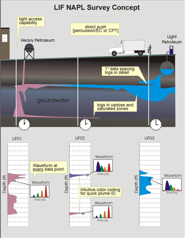 Laser-induced fluorescence (LIF) is a technique that uses laser light to excite fluorescent molecules that exist in the vast majority of hazardous non-aqueous phase liquids (NAPLs) such as petroleum fuels/oils, coal tars, and creosotes. Direct push logging of the NAPL’s inherent fluorescence with depth provides rapid and cost-effective delineation of NAPL. Conducting a multitude of LIF logs at NAPL sites allows a detailed NAPL conceptual site model (CSM).