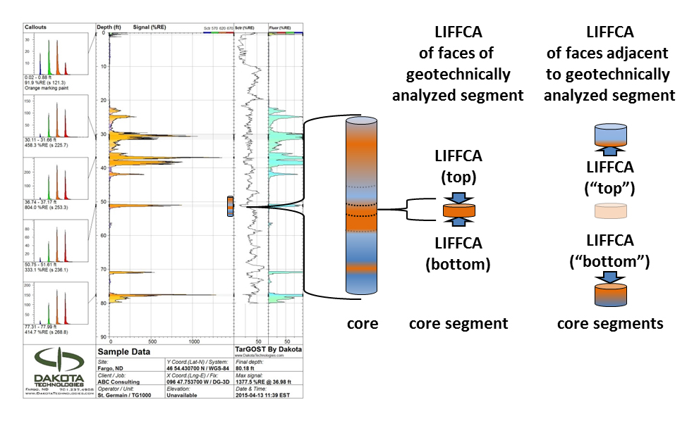 Dakota has collaborated with colleagues at CH2M to develop a laser-induced fluorescence frozen core analysis (LIFFCA) technique that allows for direct comparison of LIF response to non-aqueous phase liquid (NAPL) saturation on frozen sample segments cut from intact cores. While “homogenized splits” of soil samples have been analyzed on the benchtop with LIF for decades, LIFFCA allows for direct comparison of LIF response to geotechnical and chemical properties of the exact same intact core segment. Because LIF is a non-destructive method, the frozen sample segments can be cut from the intact cores by a laboratory that specializes in petrophysical analyses and shipped to Dakota for LIFFCA. The core segments can be subjected to LIFFCA and the exact same core segments can then later be returned for geotechnical and/or chemical testing.