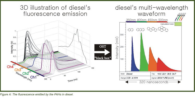 The left side of Figure A illustrates the combined spectral/temporal nature of the fluorescence emitted by the polycyclic aromatic hydrocarbons (PAHs) in diesel, and the right side shows the 2D “shorthand” style waveform characteristic of OST data.