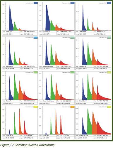 Fuels/oils contain complex chemical composition, which results in broad waveforms. The “EPA 16” PAHs only account for approximately 1 percent of the PAHs in crude oil, so there are usually a wide variety of PAHs fluorescing. From “blue to red” some common fuel/oil waveforms, shown in Figure C, include the following: