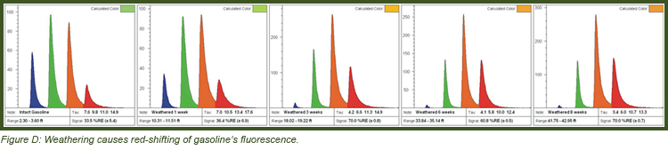 Weathering typically removes the most soluble, volatile, and readily metabolized PAHs first. Large PAHs remain behind, which causes a red-shift in the fluorescence waveform. Simultaneously there is a loss of solvent aliphatics, which often shortens the lifetime so a weathered light fuel will start to look like oil or even tar. Figure D demonstrates weathering of gasoline in a lab experiment, resulting in red-shifting that can make weathered gasoline display an “oil” waveform. When jet/kerosene weather, they simply “disappear” (become non-fluorescent) because there are too few larger PAHs to fluoresce once the naphthalenes are gone. It is important to appreciate that NAPL (especially gasolines) can vary in their appearance even prior to spilling. The degree of red-shifting is relative to the starting product and site conditions. For instance, one site’s intact (unweathered) gasoline waveform might very well be identical to different site’s moderately weathered gasoline.