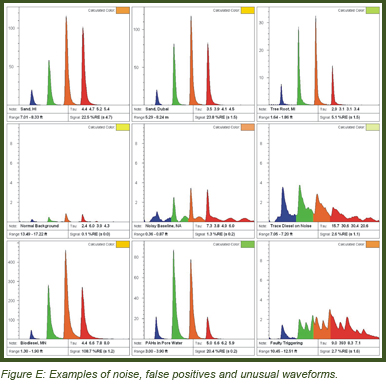 Areas with little to no contamination may fluoresce, which generates “false positives.” Figure E contains a variety of noise, false-positives, or highly unusual waveforms. Be prepared to obtain samples in order to figure out what materials are causing any odd fluorescence waveforms.