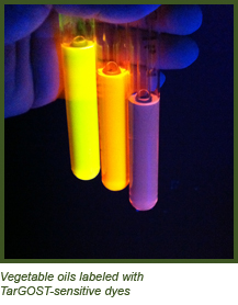 The photo shown below of dye-labeled vegetable oils illustrates this concept. The emulated TarGOST log below the photo illustrates TarGOST's semi-quantitative performance for one of those dyes used to label EVO. The log's callouts are (top-to-bottom): 0% EVO (pore water concentration), 0.055%, 0.55%, and 5.55%, and 55% EVO in pore water. To illustrate how different dye waveforms can be, a variety of waveforms generated by a few other dyes are shown below the TarGOST log.