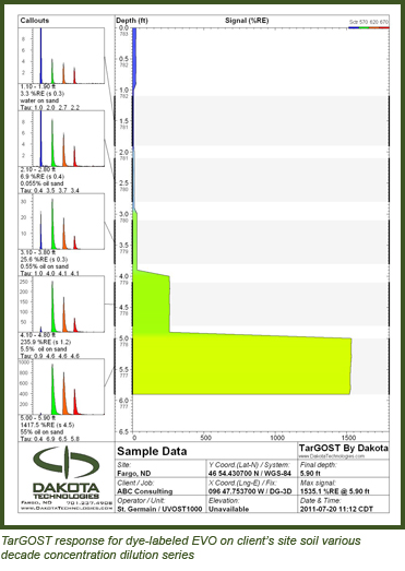 Dakota worked with a client in California to develop a dye-labeling approach to make their emulsified vegetable oil (EVO) pilot test trackable with LIF so as to allow direct assessment of the radius of influence following the direct push injection of EVO. In lab tests the TarGOST system proved to provide the highest signal-to-noise ratio for the oleophilic (oil-loving) dyes Dakota had available (relative to UVOST). Based on a series of calibration tests that were conducted prior to the pilot test using the vendor's EVO and soil from the site, a limit of detection of >= 0.05% (dye-labeled EVO in pore water) was determined for sandy soils. Dakota and the client decided to further improve TarGOST's ability to detect the injected EVO solution by dye-labeling the dilution water with a water-soluble dye (50 ppm) as well – basically doubling up with two types of dye.