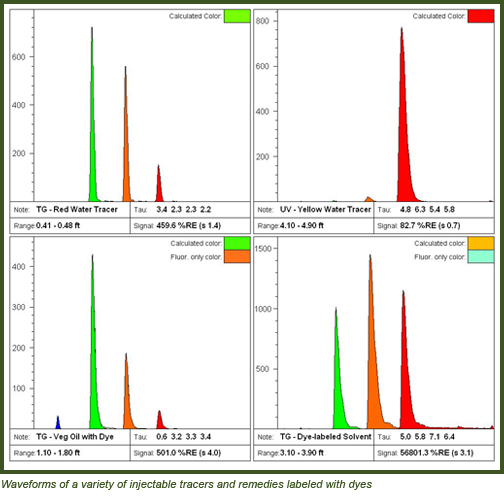There is increasing interest in injectable remedies including in-situ chemical oxidants (ISCO), solvents to enhance mobility, emulsified vegetable oil (EVO), groundwater tracers, and a host of others. Dakota Technologies has been developing methods of tracking these "injectables" with laser-induced fluorescence (LIF). Labeling an injectable remedy with an LIF-responsive dye provides the ability to map exactly where the injected fluid(s) went during and after injection using standard LIF systems such as the Tar-Specific Green Optical Screening Tool (TarGOST®) or Ultra-Violet Optical Screening Tool (UVOST®). For example, during injection pilot studies many practitioners wonder whether the injectate will be dispersed in a homogeneous "radius of influence" around the injection point as was assumed (or advertised). Or did it instead veer off in some yet-undiscovered geologic feature, reaching out like a lightning bolt in a particular direction by following a highly preferential pathway? Questions such as "Why didn't the injection reach those receiver wells that we assumed it would?" are asked quite often. With LIF tracing such questions could be readily (and accurately) answered.