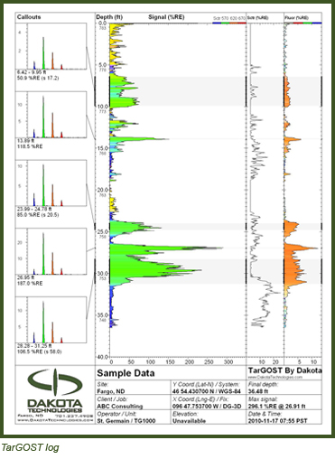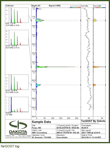 An injection of 2% molasses and 200 ppm dye was made a month prior to TarGOST being brought on site. The TarGOST log below is one example of the six logs acquired during a day of TarGOST logging. This log was done 8 feet west and 25 feet north of the injection well and it shows clearly that the injected molasses and dye were moving in preferred horizons. The green Signal and the orange Fluor (fluorescence-only) responses indicate the higher porosity horizons where the RWT/molasses solution was residing.