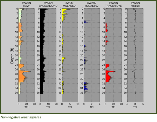 Dakota also applied a method that involves non-negative least squares (NNLS) fitting of the logs' waveforms (example above) to "clean up" and categorize the fluorescence into RWT and/or two forms of molasses fluorescence (perhaps due to oxygen concentration differences).