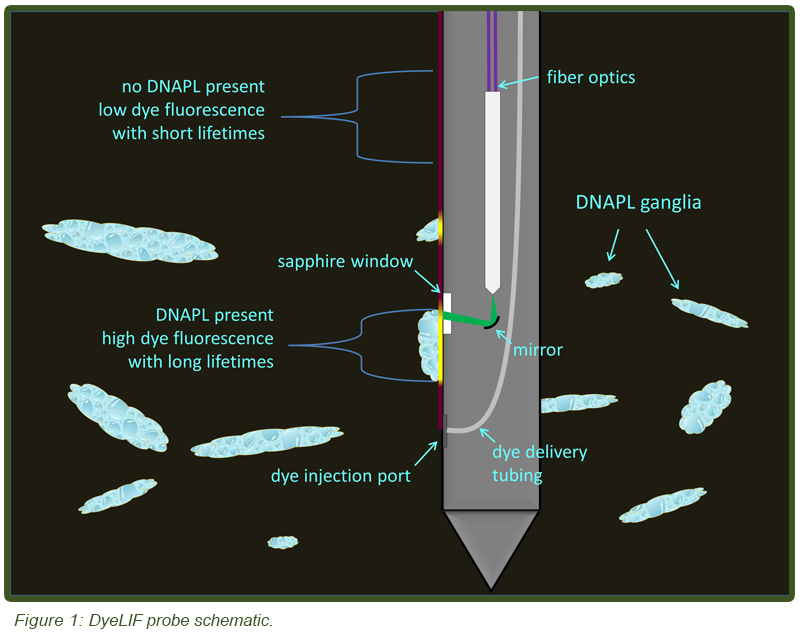 The authors recently demonstrated a direct push delivered sensor that is capable of accomplishing the ORO-like DNAPL-specific screening capability “on the fly” and in-situ. The new tool, the dye-enhanced laser induced fluorescence system or DyeLIF, is based on combining time-resolved LIF technology with the injection of a fluorescent dye ahead of the window to render non-fluorescent NAPLs fluorescent in-situ. It has potential to rapidly delineate DNAPL source zones in 3-D at sites where direct push is feasible, significantly improving prospects for targeted remediation.