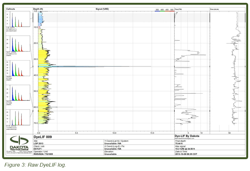 Notice also that in the raw DyeLIF log in Figure 3 (top) the back pressure and flow of injected dye solution are plotted vs. depth (two right-most data columns). The majority of logs show an increase in back pressure at or just below DNAPL responses, suggesting that the DNAPL distributed itself laterally to some degree when it encountered horizons of transition from higher to lower hydraulic conductivity. This was consistent with examination of soil cores showing DNAPL perched at interfaces transitioning to more silt content.