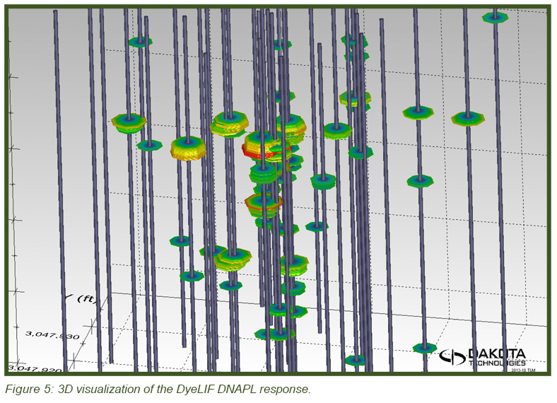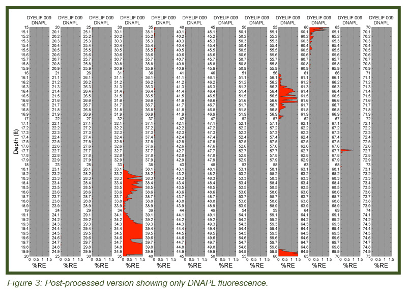 LIF waveforms are stored with each and every depth analyzed, allowing for post-processing using a non-negative least squares (NNLS) fitting process. The process uses a basis set of waveforms (nonsolvated dye, DNAPL-solvated dye, sand, etc.) to determine the origins of and then appropriate the fluorescence response. As discussed, there are dramatic spectral and temporal differences in the waveforms for DNAPL solvated dye vs. un-solvated dye. This allows us to mathematically “strip away” all but the DNAPL-specific responses, yielding high-confidence DNAPL-specific logs of DNAPL detections. Figure 3 (bottom) shows the same log after such post-processing. So that even small (but critical) DNAPL ganglia are readily recognized, the NNLS data is plotted in many columns, each five feet (1.5 m) in height. The fluorescence scaling of the processed log is held to 0-5 % RE so that even the lowest of pore saturations are obvious. The tiny response at 67.7 ft bgs is an example detection of a very small DNAPL ganglion. This post-processing requires about 5 minutes to conduct and was done on site immediately after the DyeLIF log was collected.