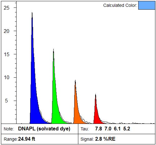 In addition to the Basis Set logs the ADA software also calculates the Residual log which is the sum of any mismatch between the synthetic waveform generated by the NNLS analysis and the raw waveform. Large residuals (relative to the original log) will result when the Basis Set does not contain waveforms similar to those encountered in the log because no matter what combination of “inappropriate” Basis Set waveforms it tries to combine, it won’t result in a waveform that assumes the same shape as the raw waveform. Large residuals are an indicator that either the Basis Set needs additional or different waveforms than those selected or that there has been saturation of the fluorescence detection system resulting in distorted raw waveforms (common on the first encounter of LNAPL with depth). Small residuals (relative to the raw fluorescence values) are an indicator that the Basis Set contained the waveforms necessary to properly fit the raw data and no Basis Set re-optimization is necessary.