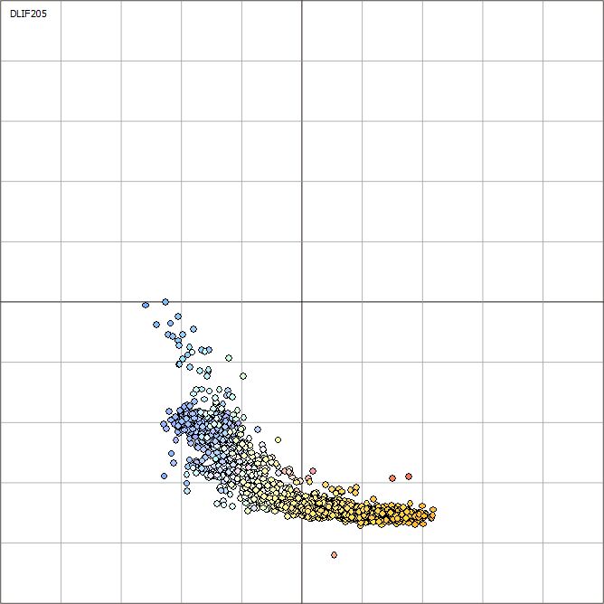 The amount of data in LIF can be overwhelming. With classification plots information from the hundreds (or even thousands) of waveforms from a single LIF log are “condensed” and then plotted on a 2D surface as color-coded spheres, allowing a spatial method of grouping or identifying clusters of fluorescence waveforms. Below is a description of characteristic classification plots and examples of how to interpret them.
