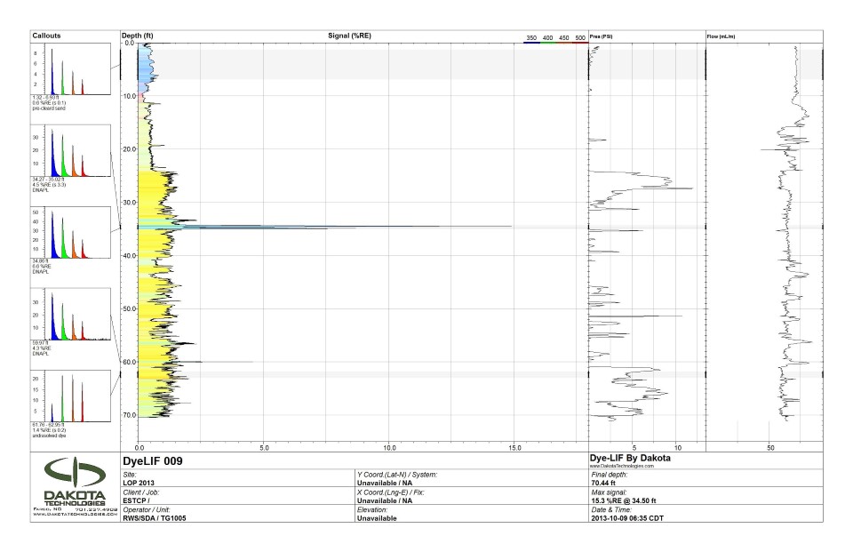 The capability of the DyeLIF was recently demonstrated at a small footprint chlorinated spill site in Massachusetts. Tests of chlorinated solvent DNAPL recovered from the site revealed a mixture of 59% trichloroethylene, 34% 1,1,1-trichloroethane with various solvents and petroleum hydrocarbons making up the balance. Local geology in the demonstration area can be generally classified as fine sand and silt with intermittent silt and clay layers. A continuous silt layer is observed at 14 m below ground surface (bgs), which is consistent with other areas of the larger site.