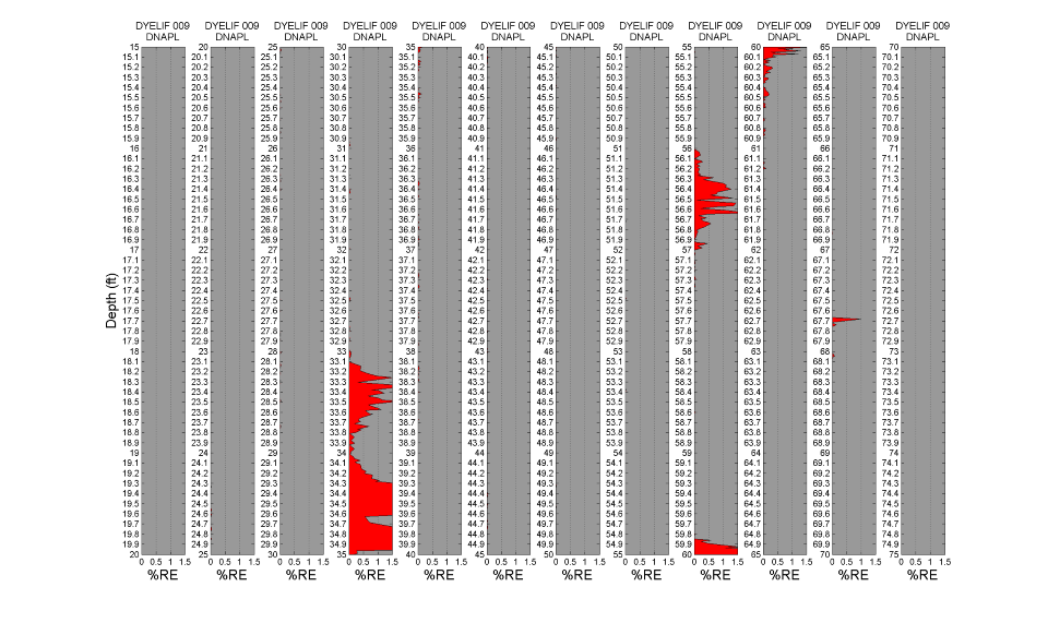 LIF waveforms are stored with each and every depth analyzed, allowing for post-processing using a non-negative least squares (NNLS) fitting process. The process uses a basis set of waveforms (non-solvated dye, DNAPL-solvated dye, sand, etc.) to determine the origins of and then appropriate the fluorescence response. As discussed, there are dramatic spectral and temporal differences in the waveforms for DNAPL solvated dye vs. un-solvated dye. This allows us to mathematically strip away all but the DNAPL-specific responses, yielding high-confidence DNAPL-specific logs of DNAPL detections. The image below shows the same log after such post-processing. So that even small (but critical) DNAPL ganglia are readily recognized, the NNLS data is plotted in many columns, each five feet (1.5 m) in height. The fluorescence scaling of the processed log is held to 0-5 %RE so that even the lowest of pore saturations are obvious. The tiny response at 67.7 ft bgs is an example detection of a very small DNAPL ganglion. This post-processing requires about 5 minutes to conduct and was done on site immediately after the DyeLIF log was collected. Note the data in this plot is zoomed in such that each column represents 5 feet of depth.