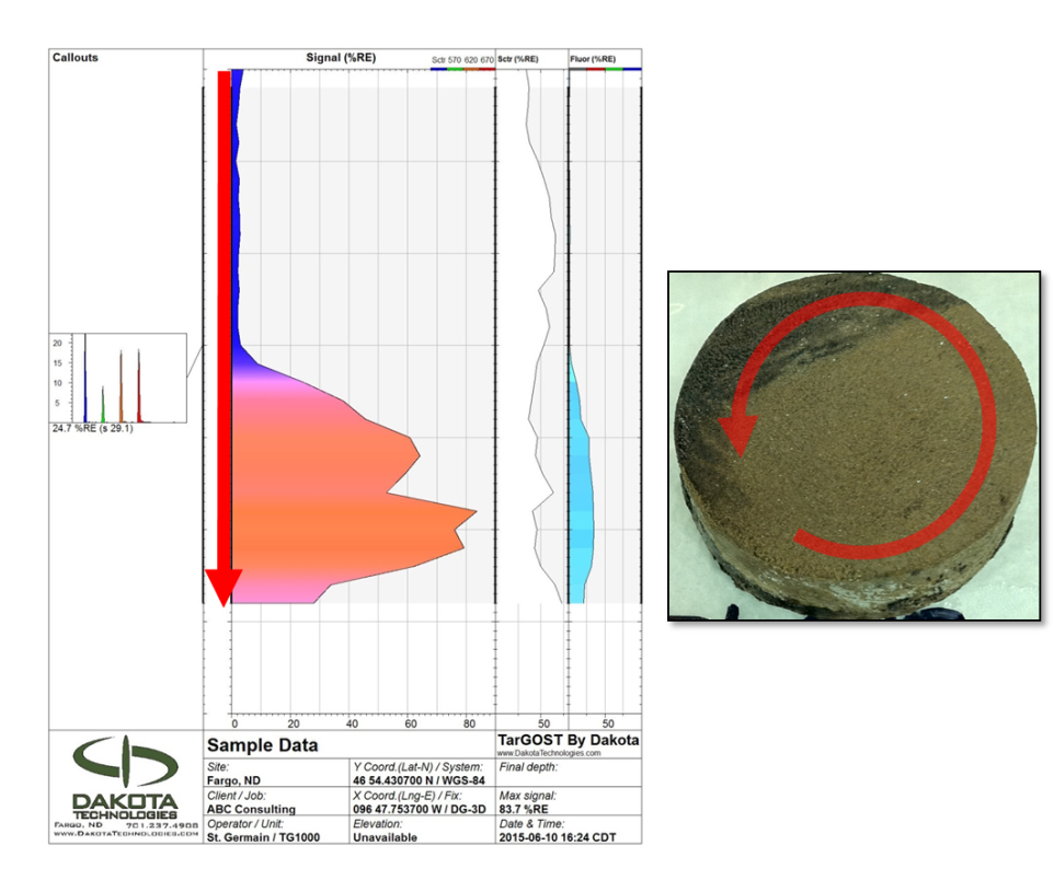 Dakota has collaborated with colleagues at CH2M to develop a laser-induced fluorescence frozen core analysis (LIFFCA) technique that allows for direct comparison of LIF response to non-aqueous phase liquid (NAPL) saturation on frozen sample segments cut from intact cores. While “homogenized splits” of soil samples have been analyzed on the benchtop with LIF for decades, LIFFCA allows for direct comparison of LIF response to geotechnical and chemical properties of the exact same intact core segment. Because LIF is a non-destructive method, the frozen sample segments can be cut from the intact cores by a laboratory that specializes in petrophysical analyses and shipped to Dakota for LIFFCA. The core segments can be subjected to LIFFCA and the exact same core segments can then later be returned for geotechnical and/or chemical testing.