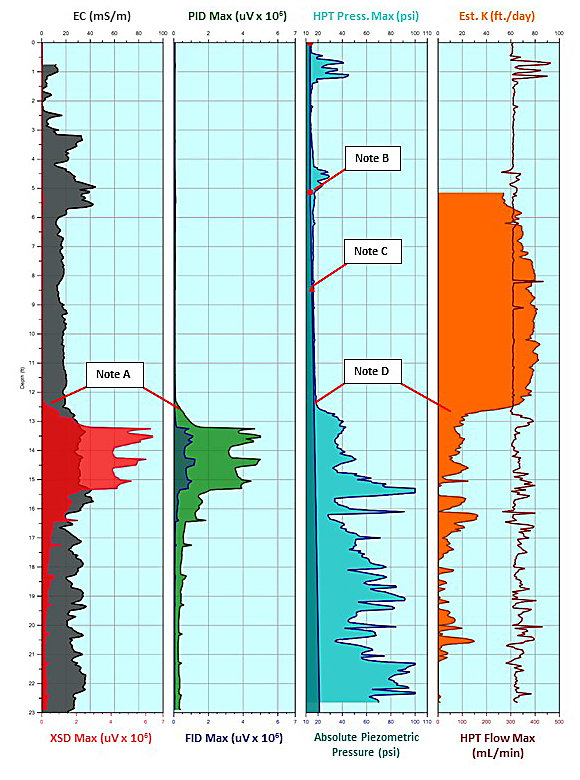 The HPT pressure gives insight into hydraulic properties of the soil as water is pumped into the formation at a constant rate. The pressure (unlike EC) is independent of certain factors such as pore water chemistry or mineralogy (contaminants, brines), and so further aids in defining soil/hydraulic properties. Potential contaminant migration pathways can be better understood when pressure data are viewed in relation to detector responses.