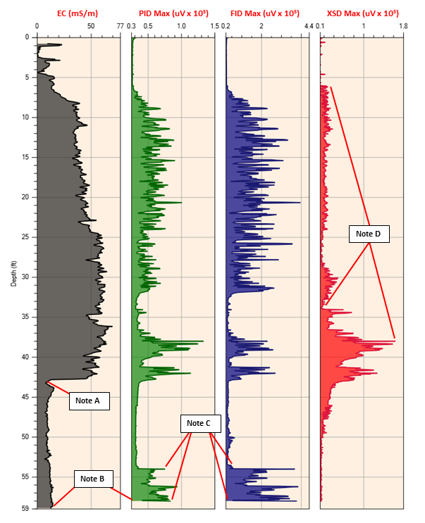 PID and FID responses (in the absence of an XSD response) at 54 to 58 feet are indicative of aromatics or other unsaturated hydrocarbon contamination (50 to 100 ppm gas in this example).